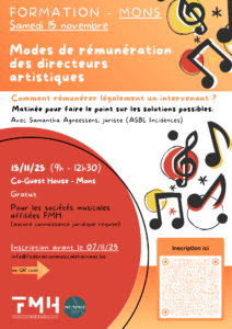 La prochaine de ces formations portera sur la rémunération des directeurs artistiques : la formation fera l’inventaire des possibilités légales existantes permettant de rémunérer certaines prestations (les directeurs artistiques, mais aussi d’éventuels renforts, un soliste invité, une master class, un animateur de stage d’été, …) d’une manière à la fois légale et attentive aux moyens et contraintes des sociétés.
